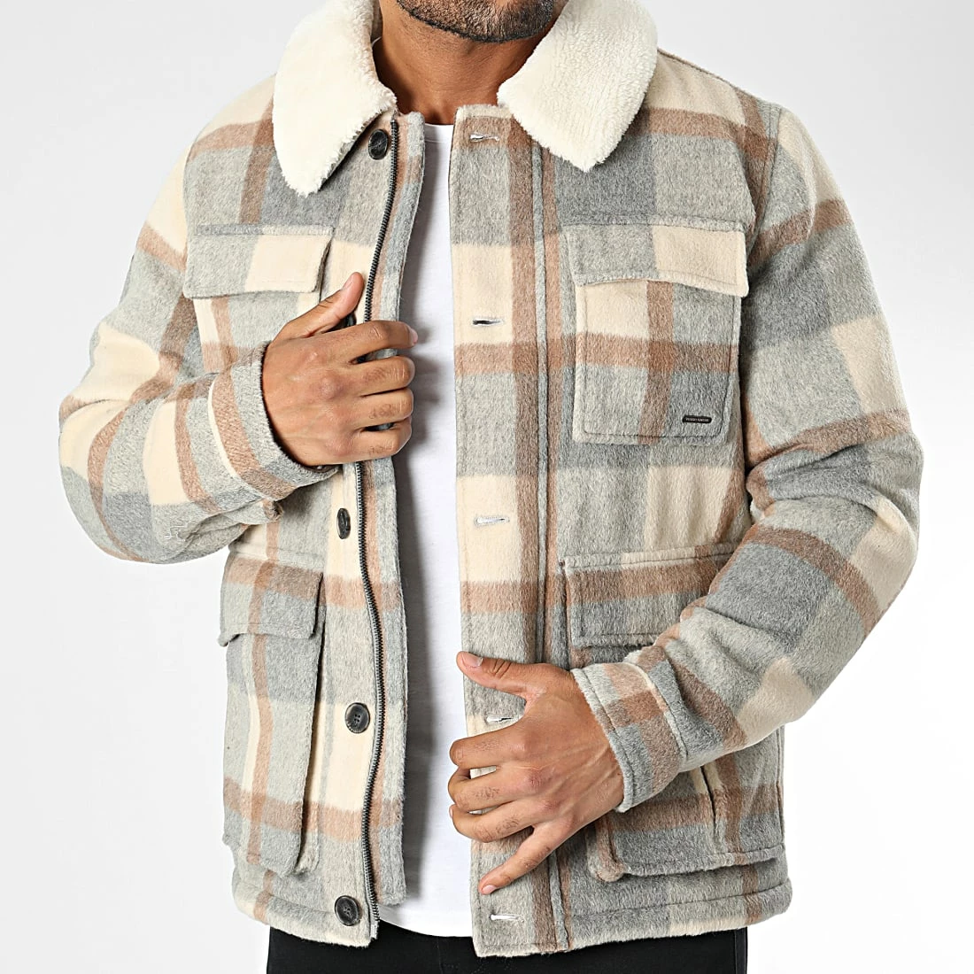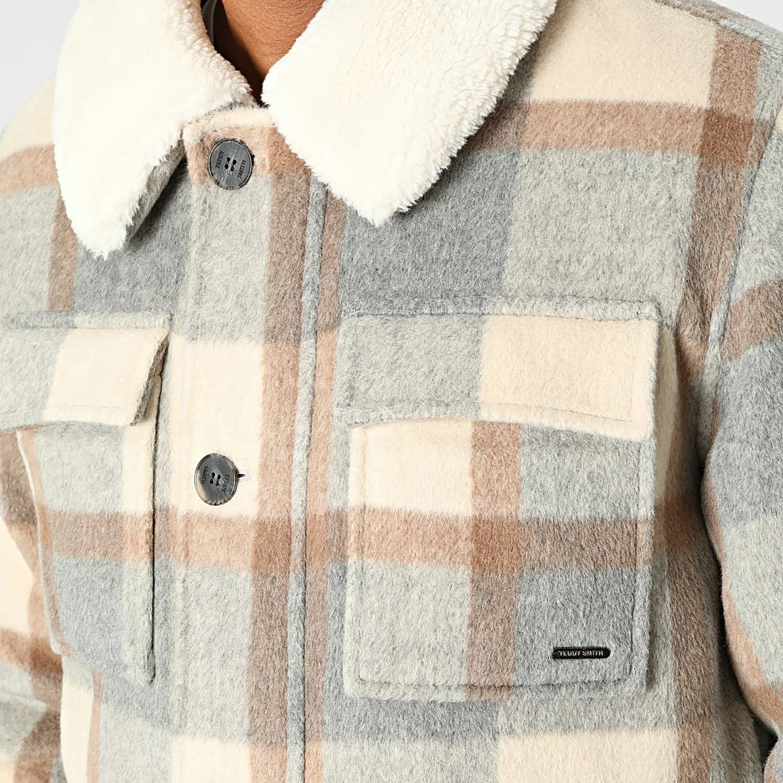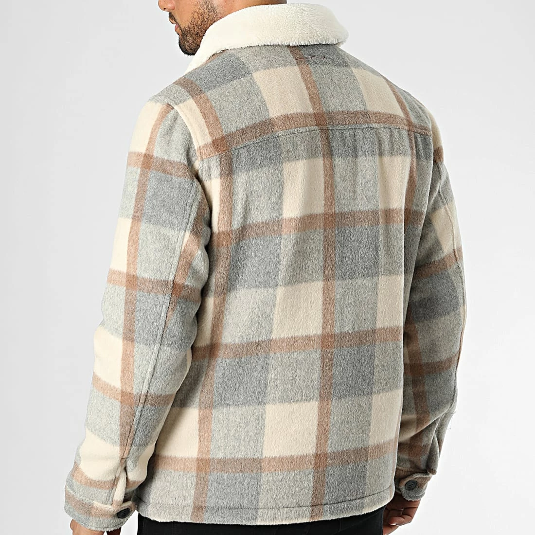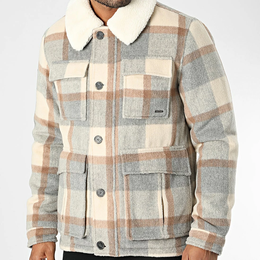 • Veste à carreaux épaisse et douce avec col en fourrure synthétique